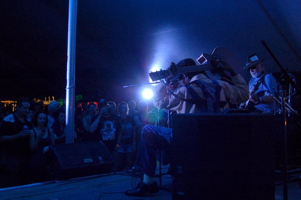There was still plenty of blues music to go around though. Cashman who’d been on site for weeks constructing the new fleet of Muddy Roots cabins made a great appearance on the second stage at 6:30 on Sunday. He made it rain…literally, as it was during his set that the heavy weather showed up. James Leg wins the award for the loudest band all weekend with his roaring Rhodes piano accompanied on guitar by Muddy Roots 2011 performer Mark “Porkchop” Holder. The Hooten Hallers who played early Friday evening have made it on to many people’s lists as one of their favorite sets from the weekend.